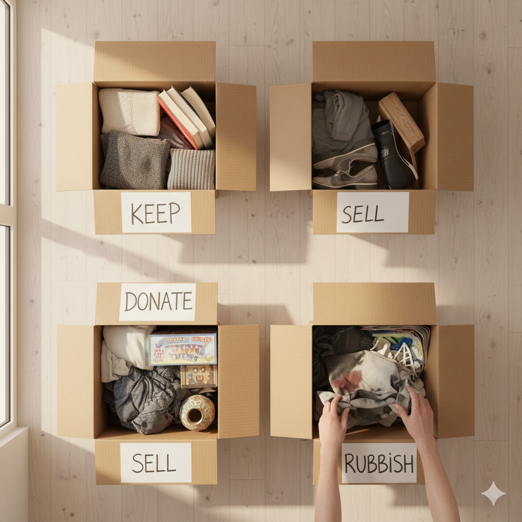 Grab four boxes or bins and label them: Keep, Donate, Sell, Rubbish. As you go through each area, every item must go into one of these boxes. No “maybe” pile, that’s where decluttering efforts go to die. This method forces decisive action and gives you a clear system.