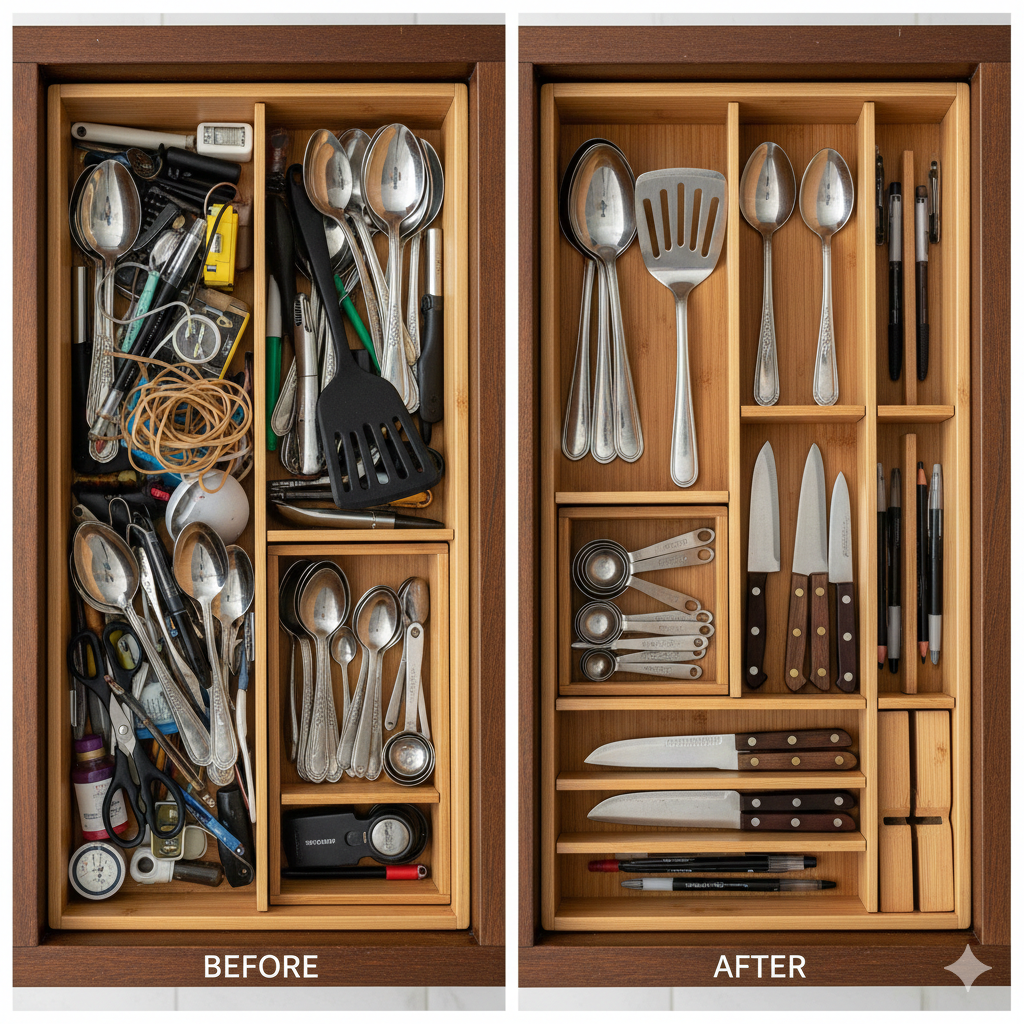 These are game-changers. Drawer organisers for cutlery, utensils, makeup, and bathroom products prevent the dreaded junk drawer phenomenon. Everything has a designated spot, making it easy to maintain order.