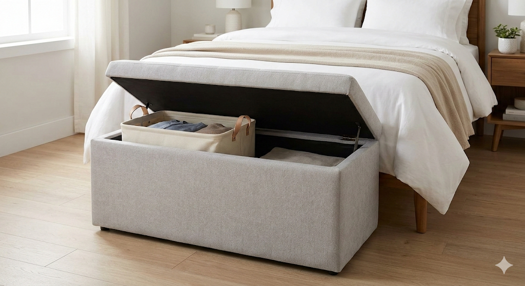 - Dual-Purpose Furniture: Invest in a storage ottoman or a bench at the foot of your bed. These pieces offer a hidden compartment where you can tuck away a slim basket that is easily removable.