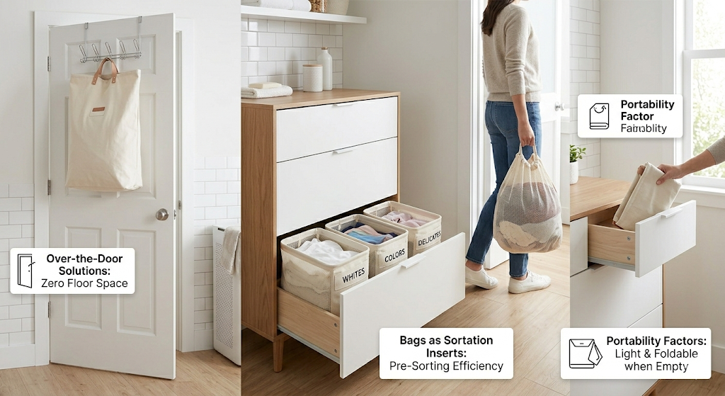 - Over-the-Door Solutions: Utilize the back of your bathroom or bedroom door. There are elegant canvas bags designed to hang on hooks, taking up zero floor space.