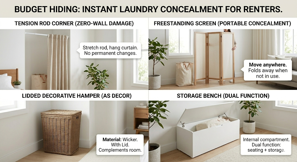 - Tension Rod with Curtain: Install a tension rod across a corner or inside an open alcove and hang a simple curtain panel from it. This creates an instant “hidden zone” for a laundry basket at zero cost to your walls.