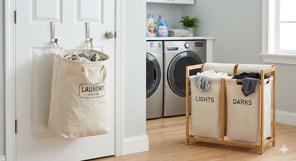 - Over-the-door canvas laundry bag: A simple, inexpensive product that hangs on any standard door. Easy to search for and widely available in neutral colors.