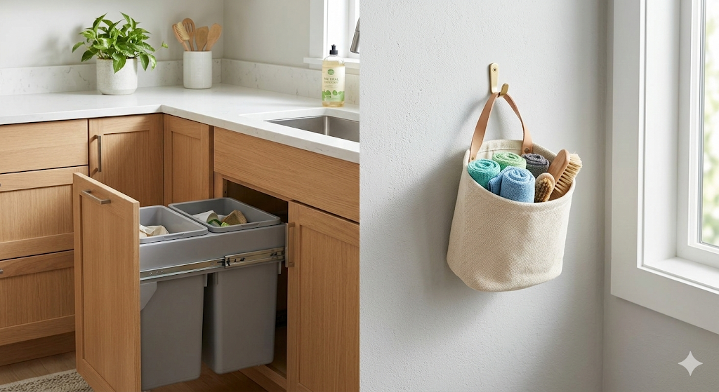 - Pantry Door Hook: Hang a compact canvas bag on the inside of your pantry or utility cupboard door. It takes up zero floor space and stays neatly out of view.