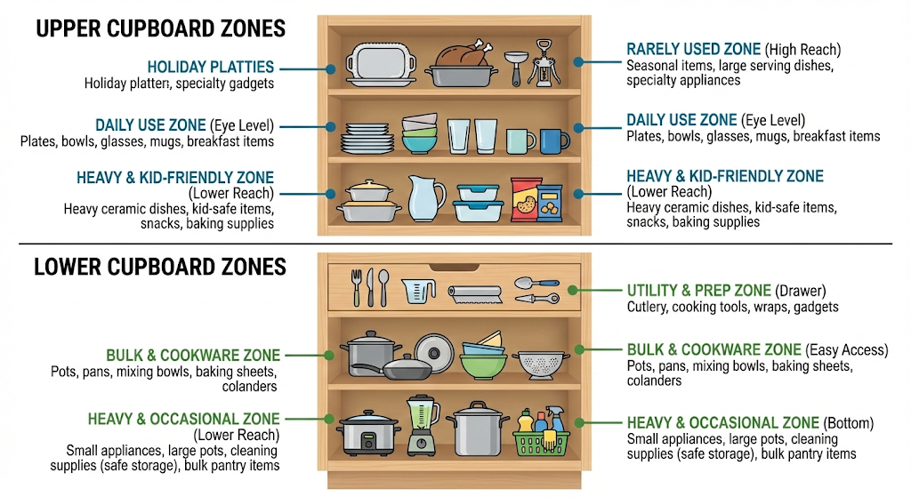Best cupboard zones for standard cupboard When planning your kitchen cabinet organization, think in triangles. Keep your daily plates and cups directly above the dishwasher or drying rack for easy unloading. Create a “cooking zone” near the stove for oils and spices. This logical flow is the hallmark of a well organised kitchen, saving you hundreds of steps a day.