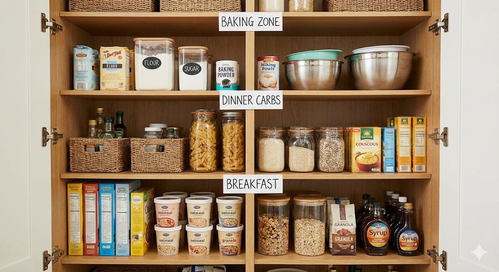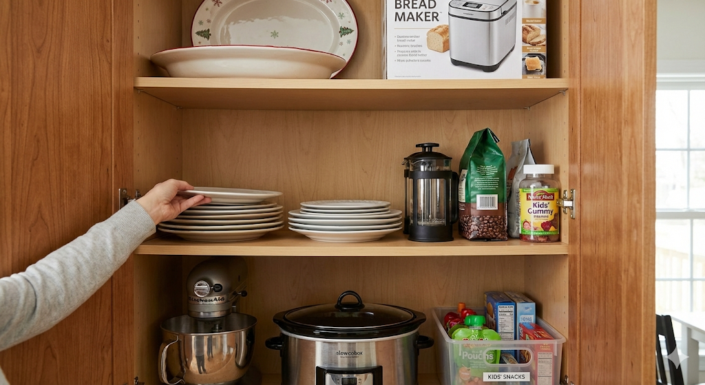 • Eye level: Things you use daily (coffee, plates, kids’ vitamins).