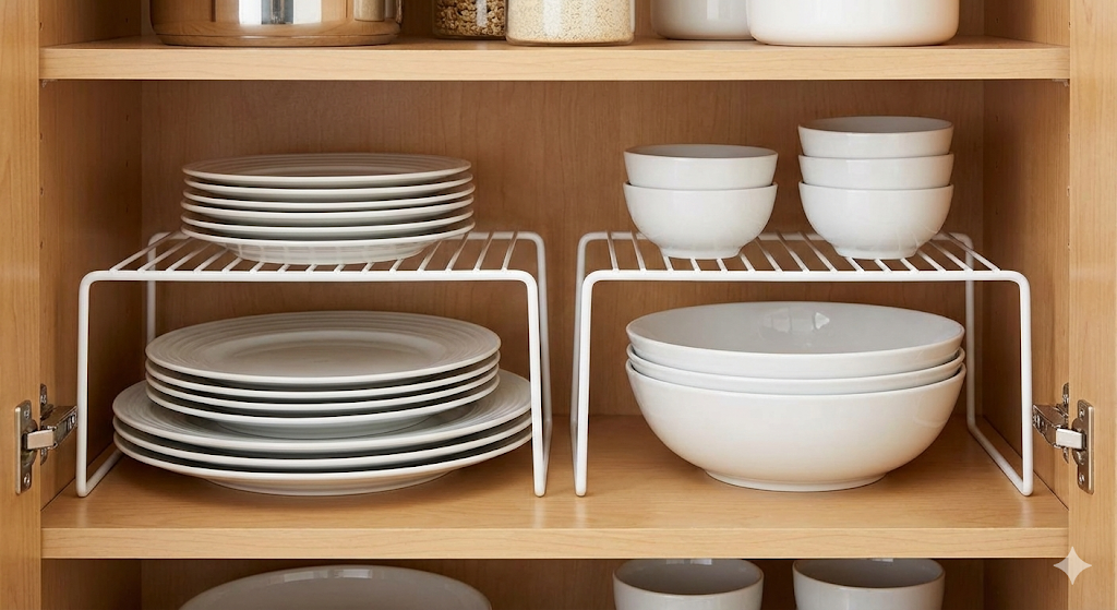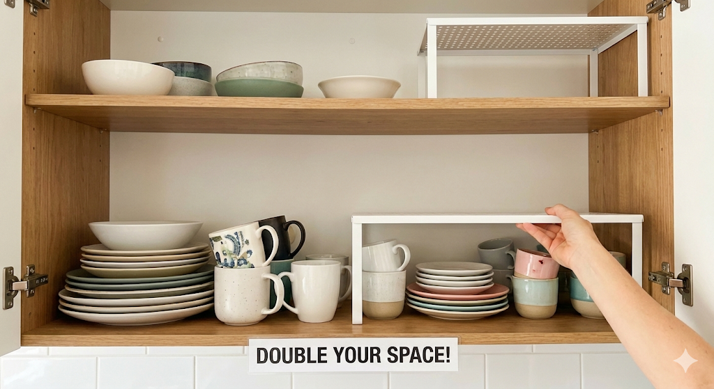 Most Australian cabinets have huge gaps between shelves. This is wasted air! Use shelf risers to double your space. This lets you stack plates or cans without creating a tower of doom that topples over when you grab the bottom one.