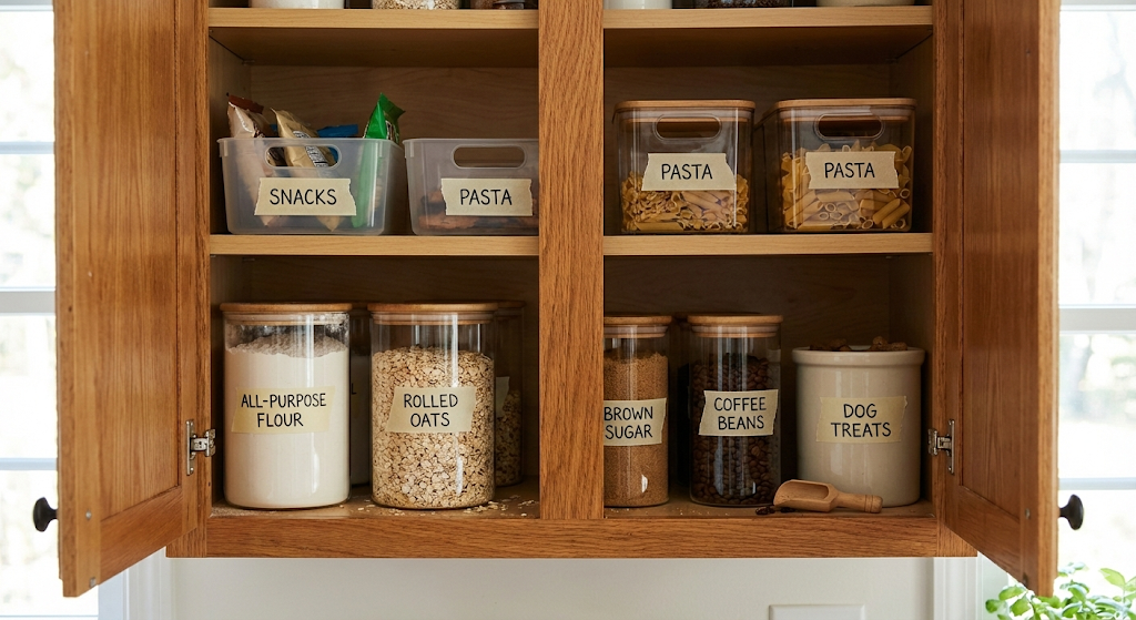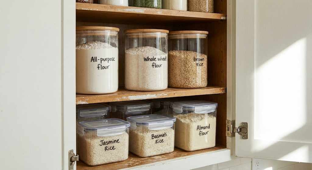 You’ve seen the TikToks of perfect glass jars. It looks pretty, but if you are time-poor, don’t pressure yourself. However, if you have bulk items (like flour or rice) that always spill, putting them into clear, airtight food storage containers is one of the best ways to organize kitchen cabinets for hygiene and freshness. Why use them? Square or rectangular food storage containers stack efficiently, unlike awkward bags that slump over. This maximizes your kitchen cupboard storage capacity and keeps pantry moths out of your flour.