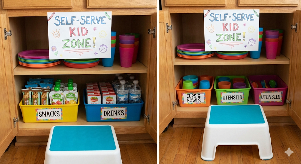 This is for you as much as them. Designate a lower drawer or basket specifically for kids’ snacks and plastic bowls. When they say “Mum, I’m hungry” for the 50th time, you can say, “Go to the snack basket.” It fosters independence and keeps them out of your breakable wine glass cupboard.